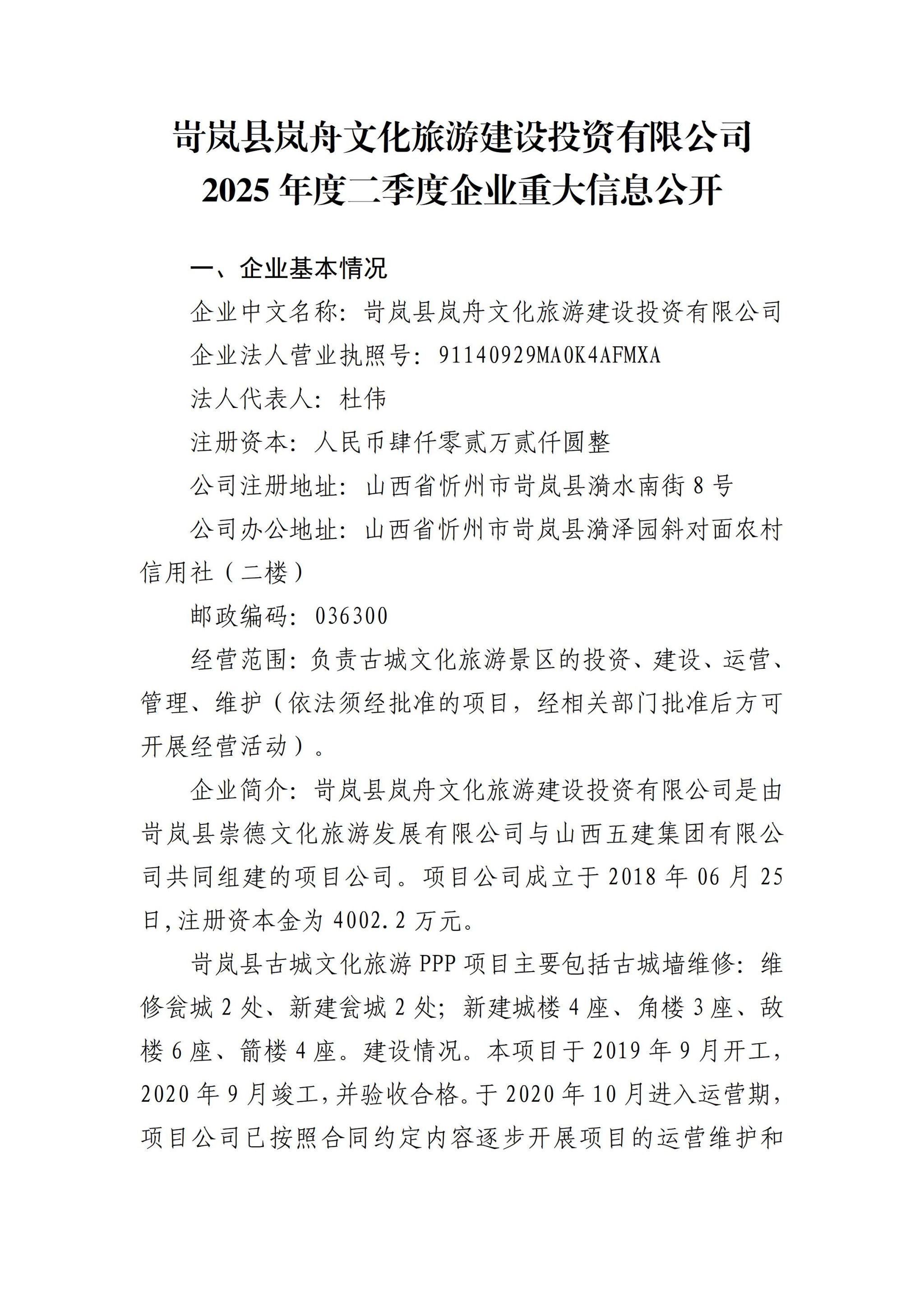 岢岚县岚舟文化旅游建设投资有限公司2025年第二季度企业重大信息公开