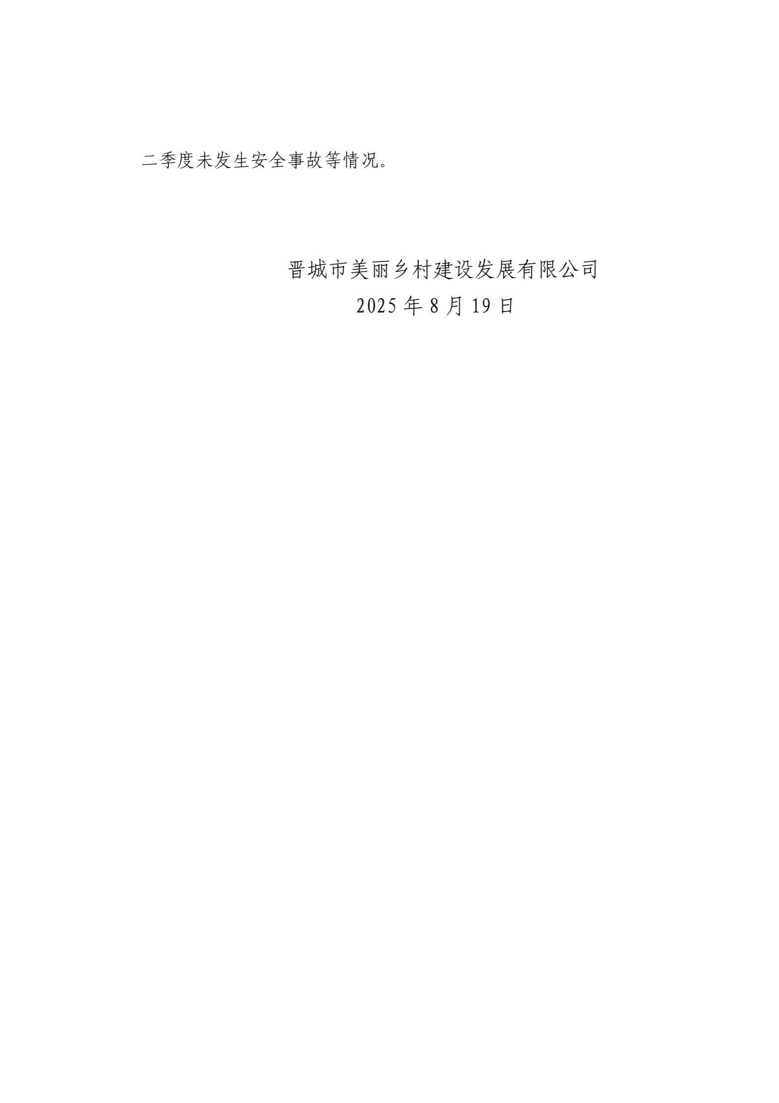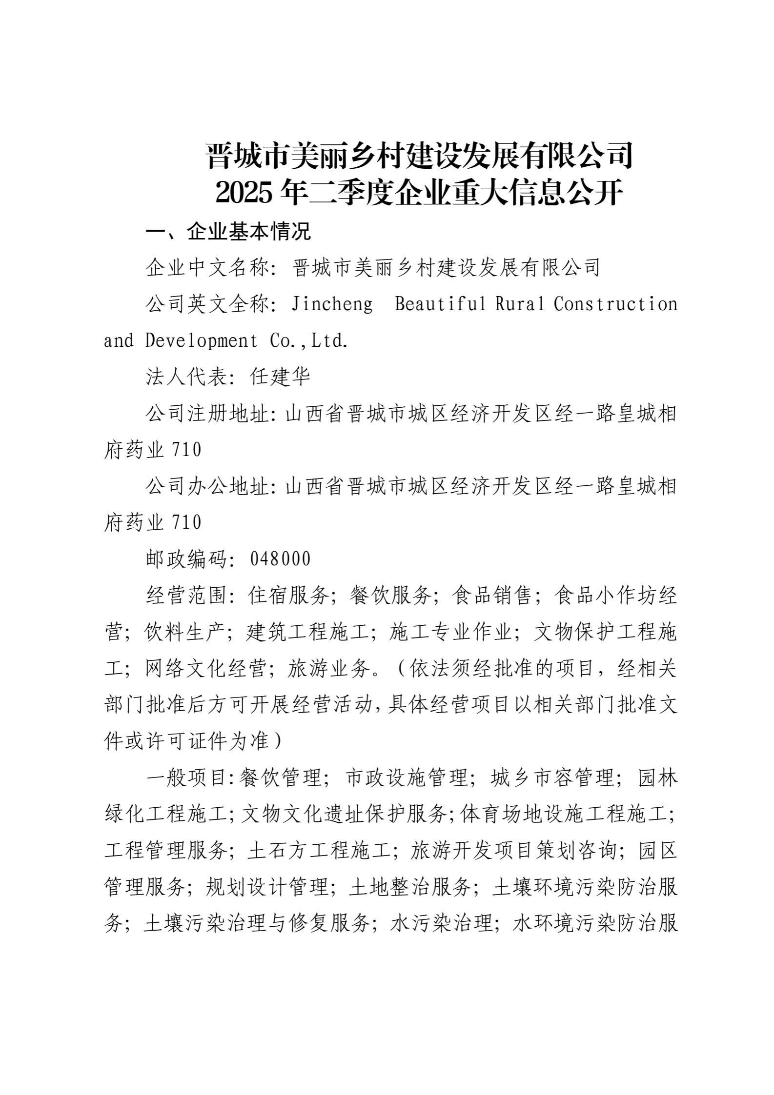 晋城市美丽乡村建设发展有限公司2025年二季度企业重大信息公开