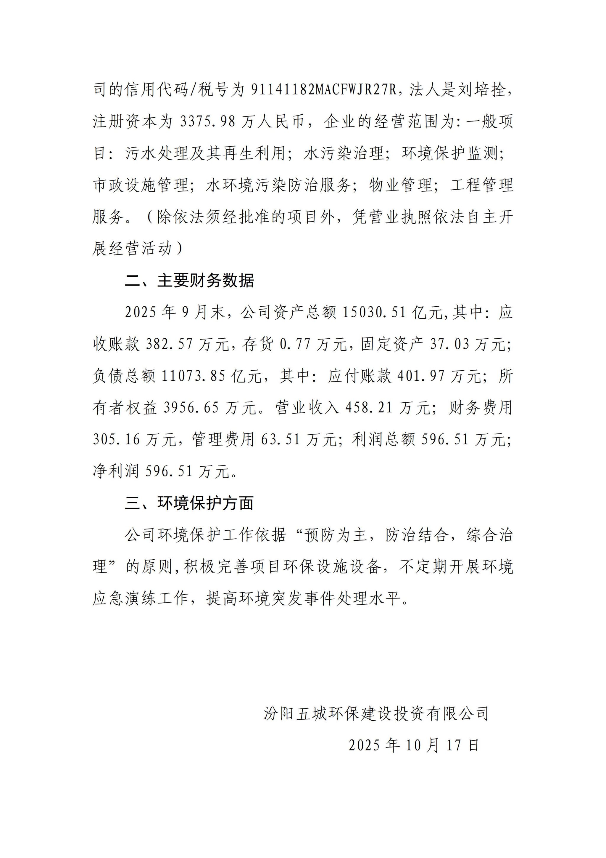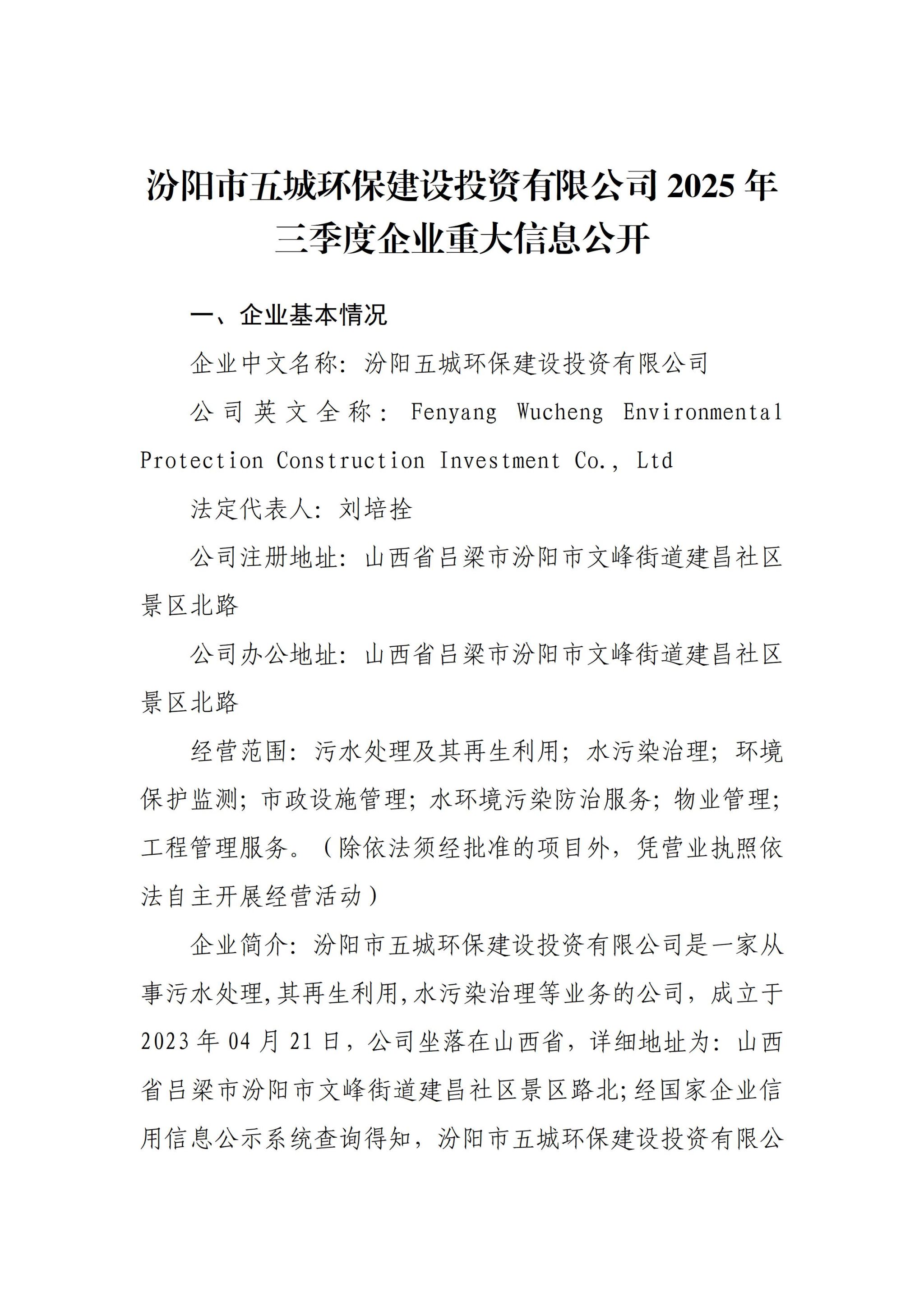 汾阳五城环保建设投资有限公司2025年三季度企业重大信息公开