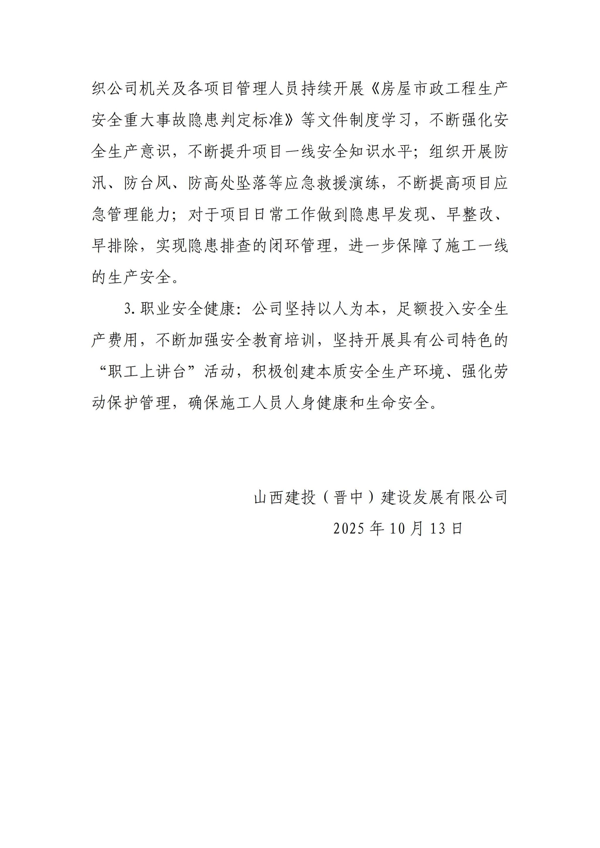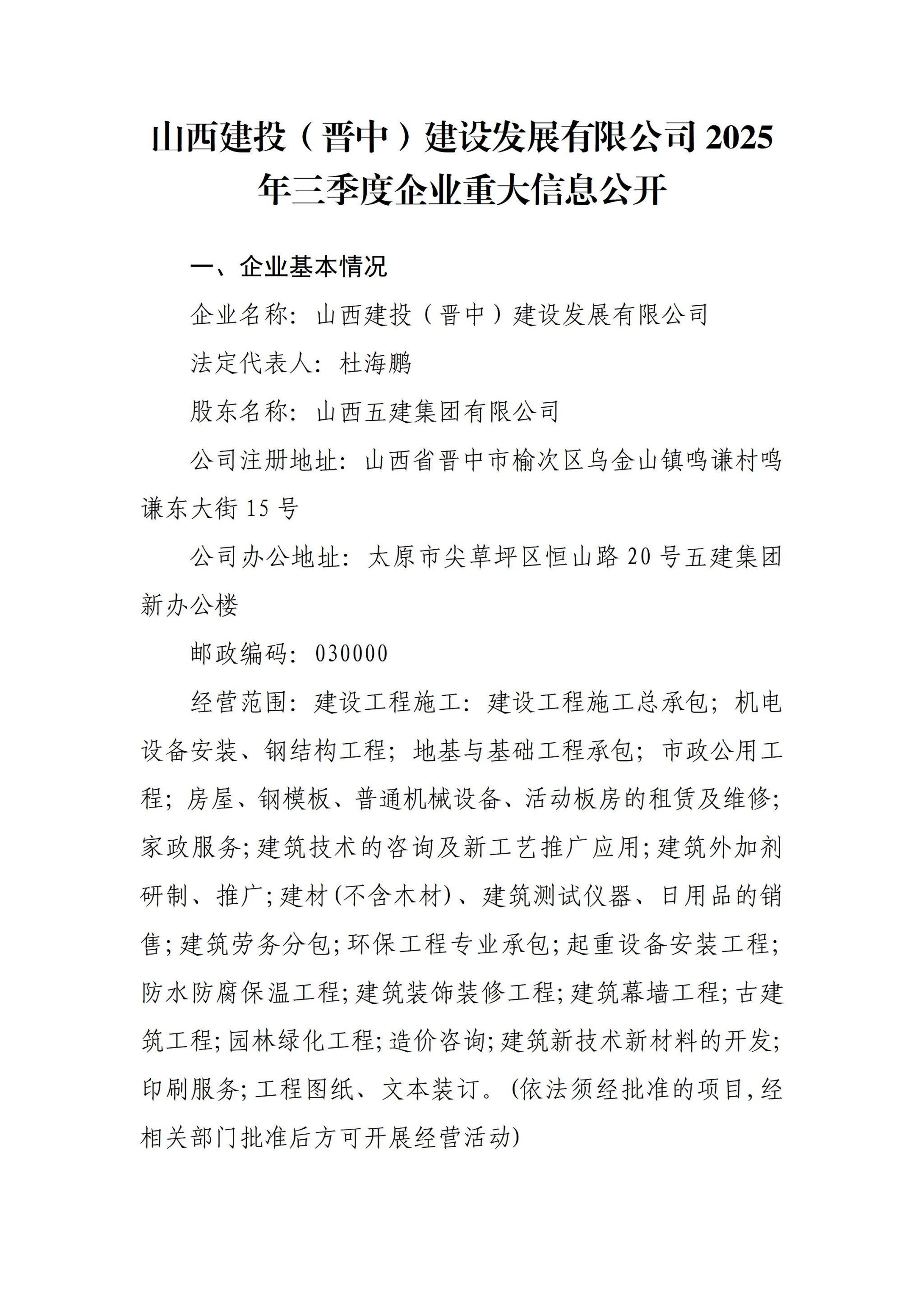 山西建投(晋中)建设发展有限公司2025年三季度企业重大信息公开