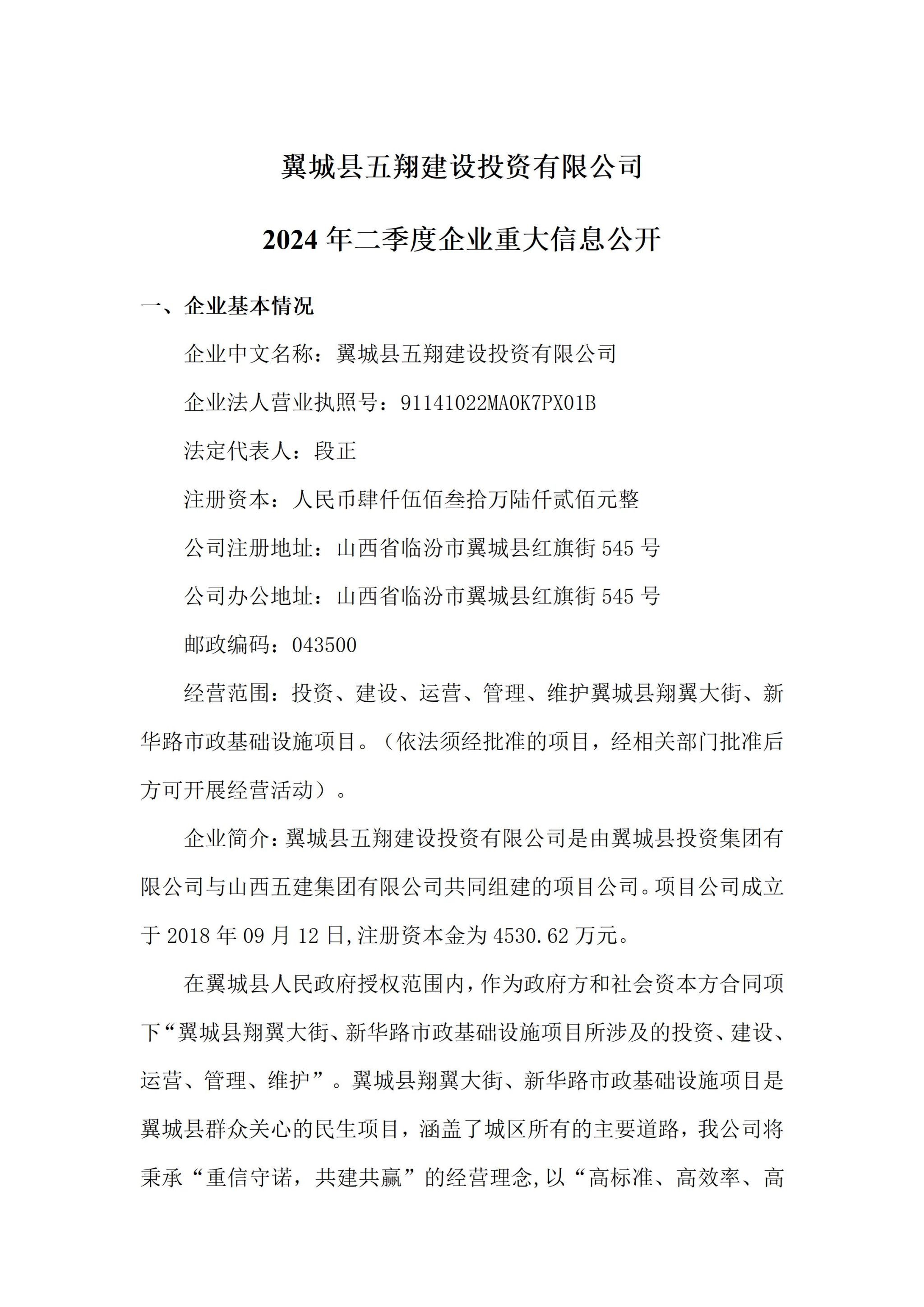 翼城县五翔建设投资有限公司2024年二季度企业重大信息公开