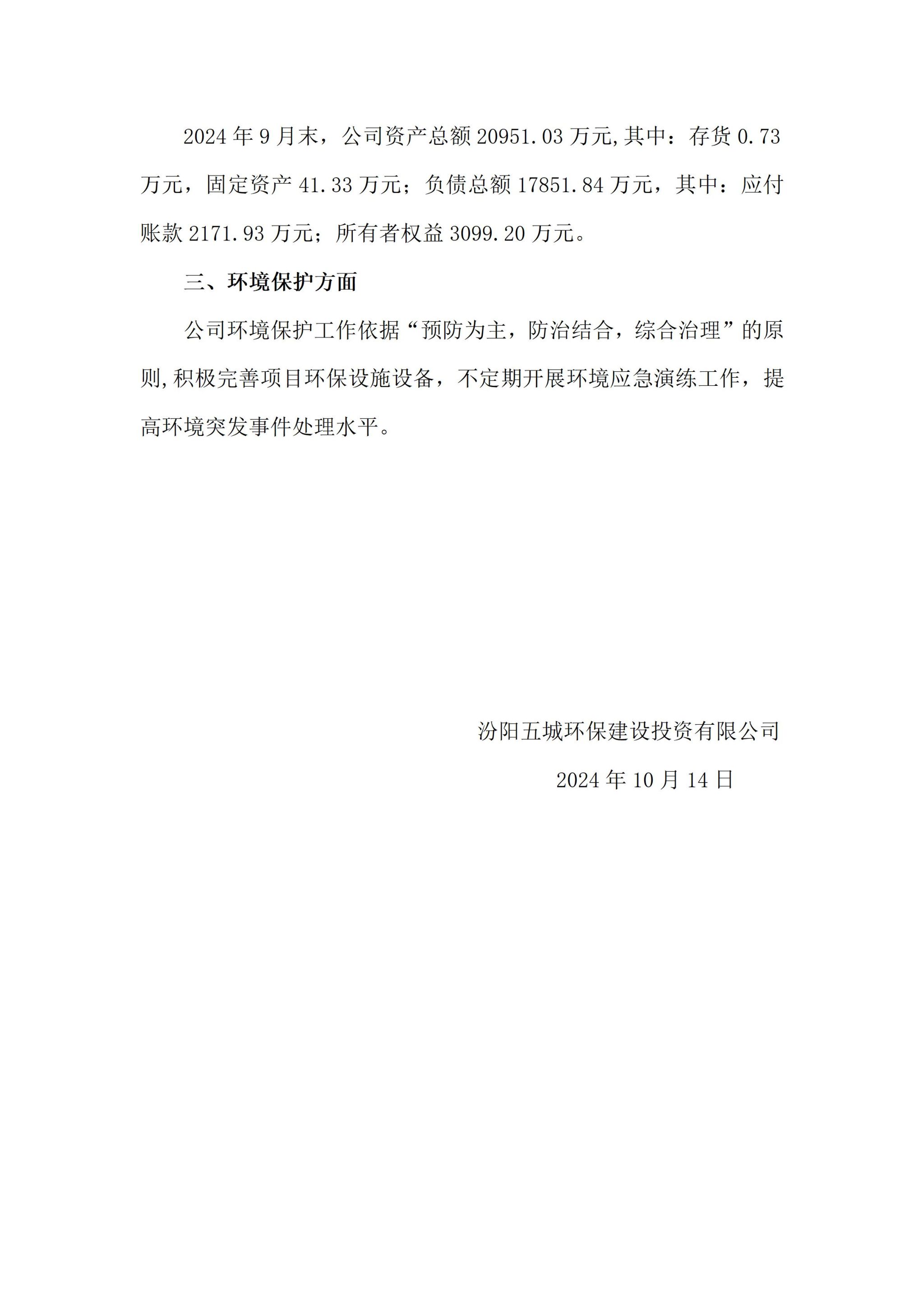 汾阳五城环保建设投资有限公司2024年三季度企业重大信息公开