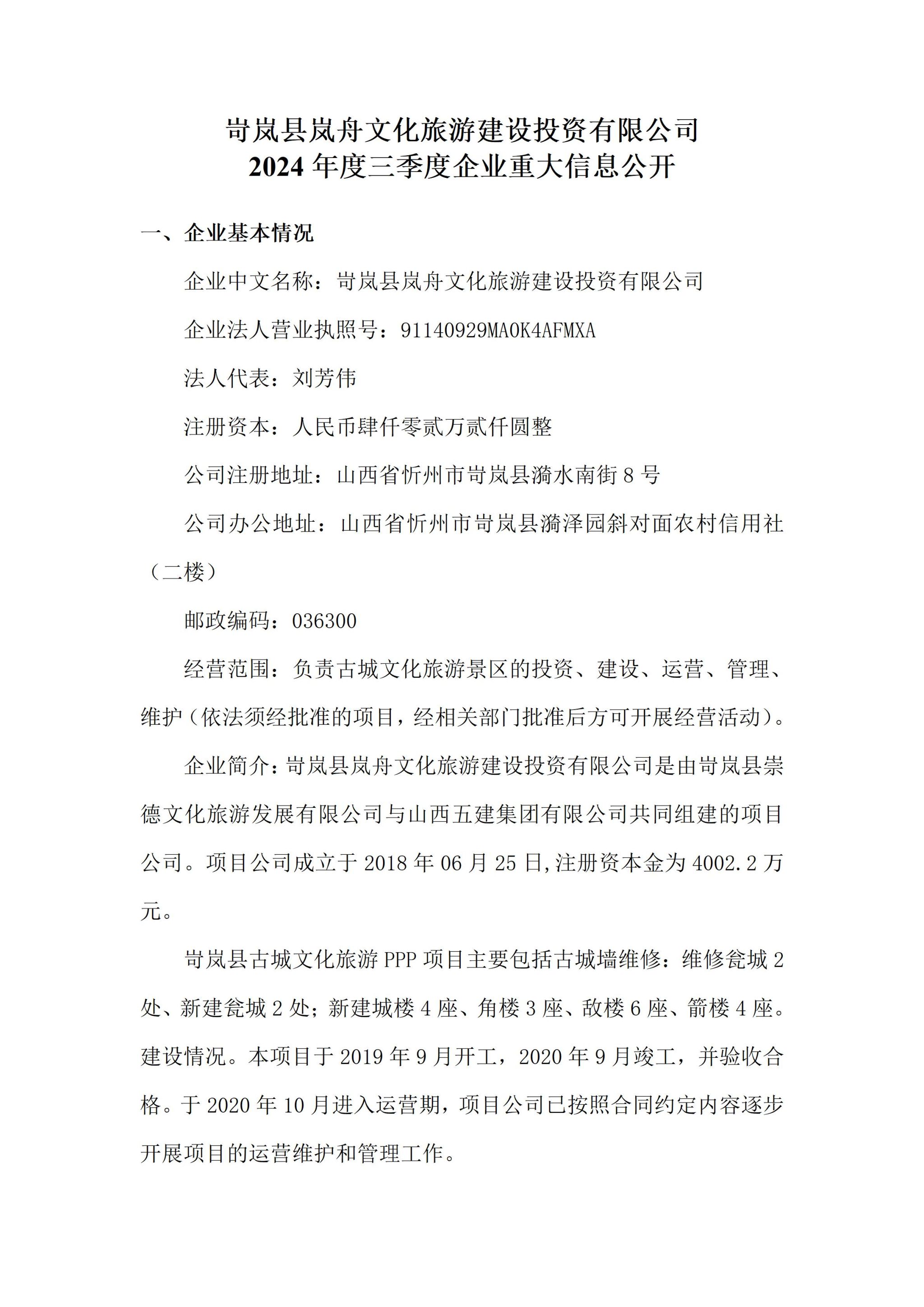 岢岚县岚舟文化旅游建设投资有限公司2024年第三季度企业重大信息公开