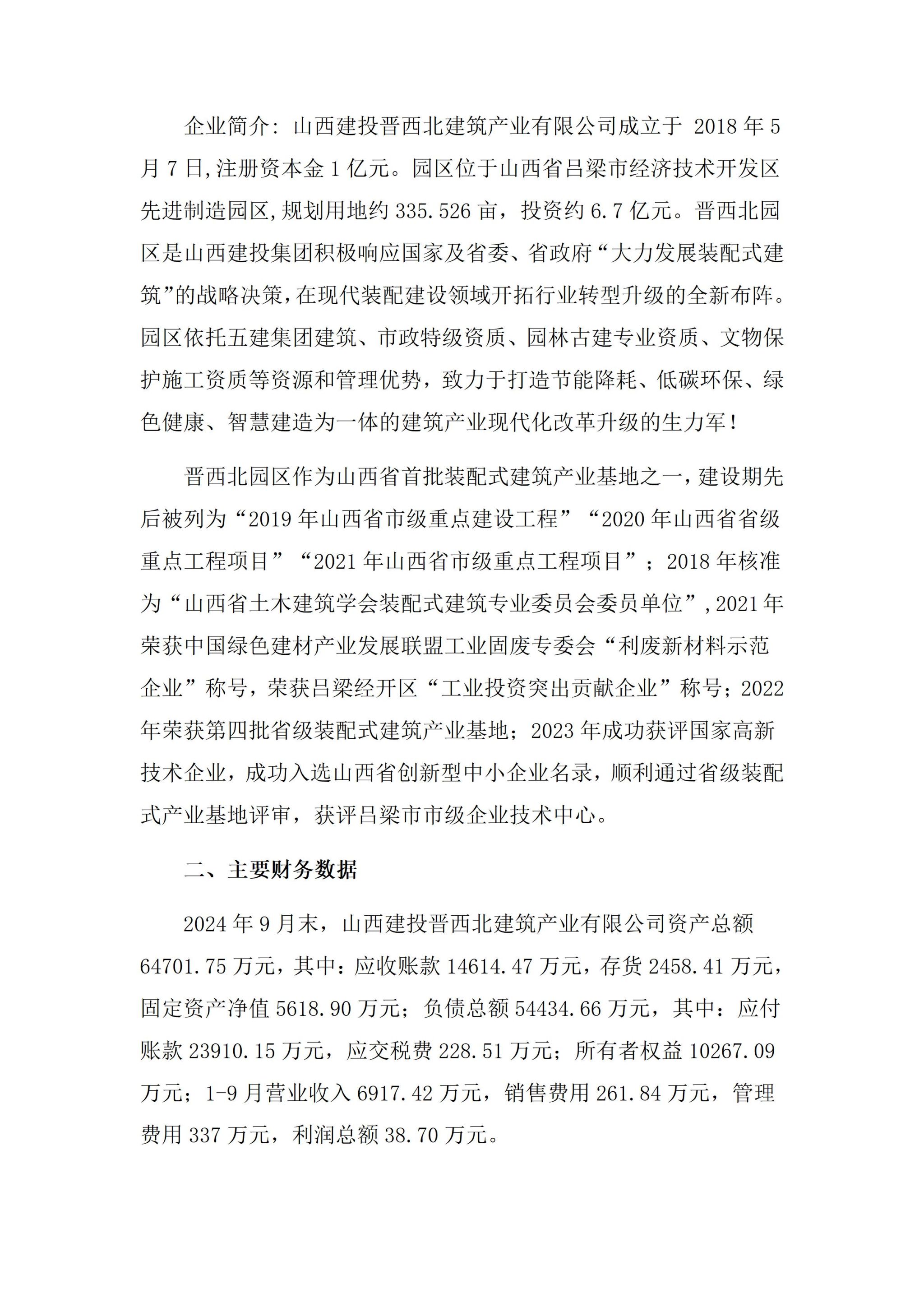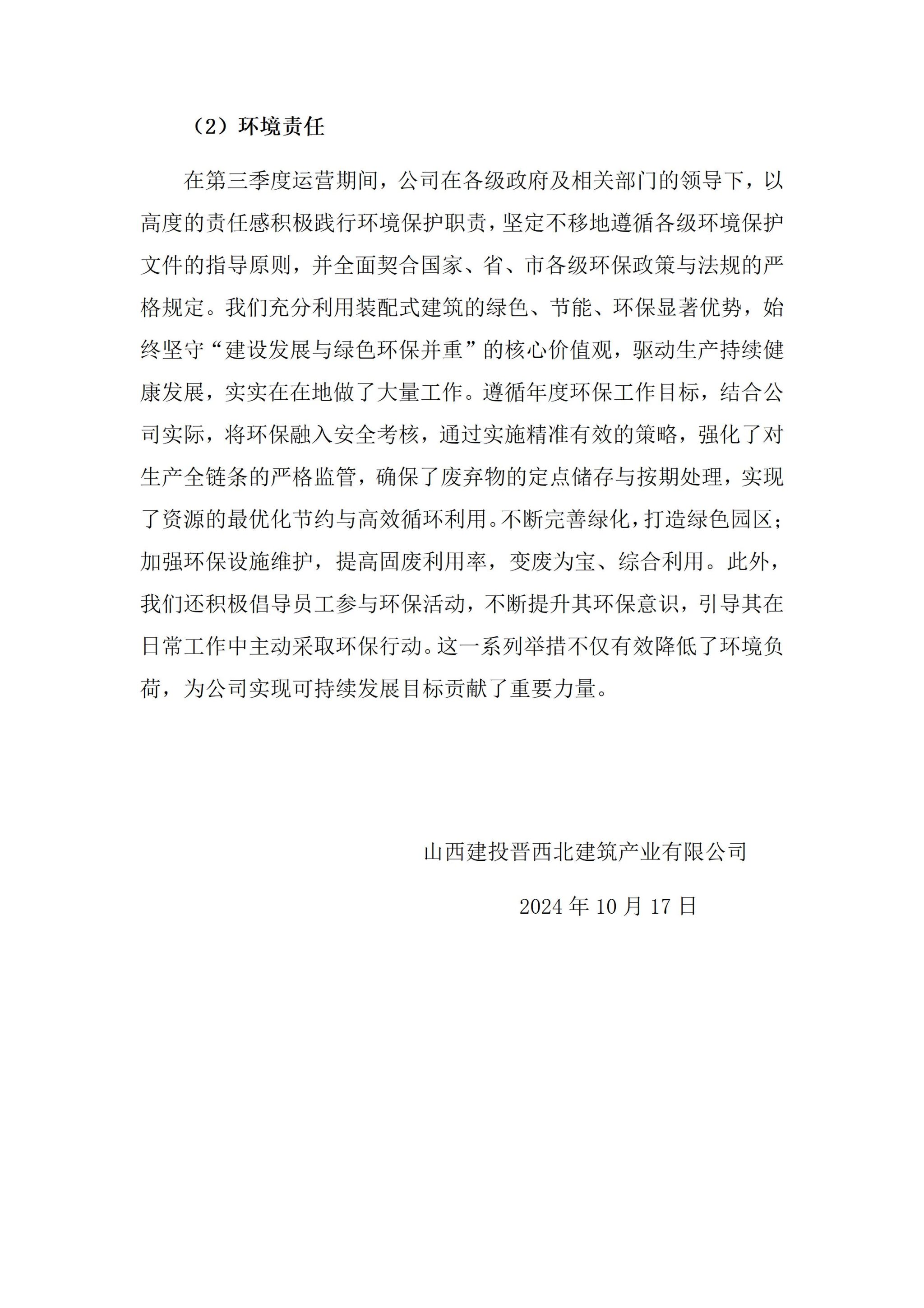 山西建投晋西北建筑产业有限公司2024年三季度重大信息公开