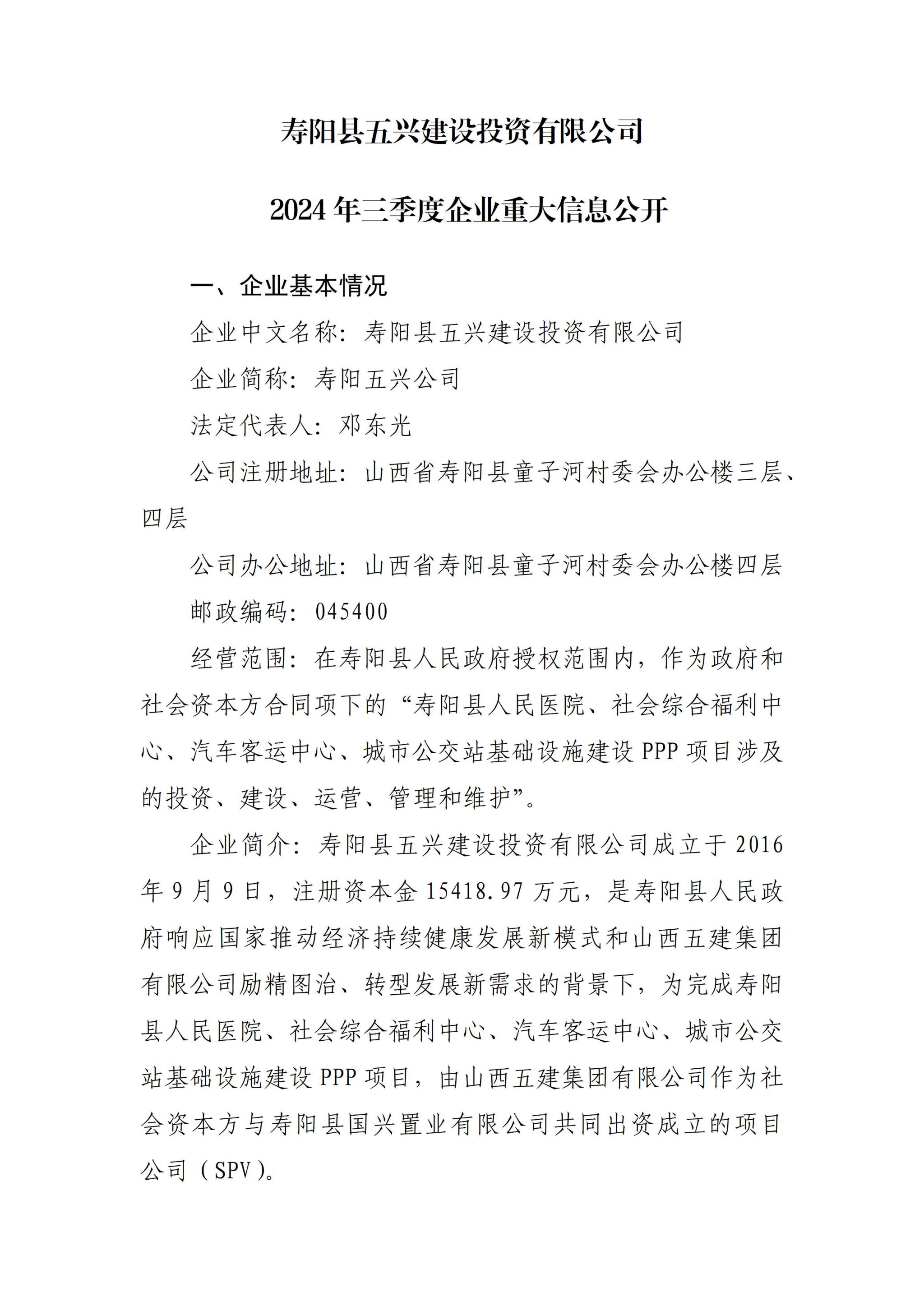 寿阳县五兴建设投资有限公司2024年三季度企业重大信息公开
