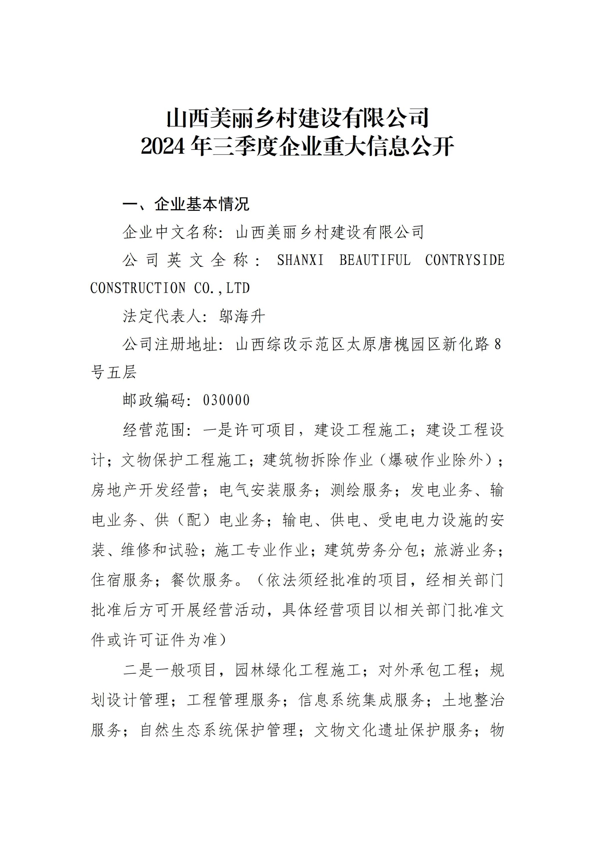 山西美丽乡村建设有限公司2024年三季度企业重大信息公开
